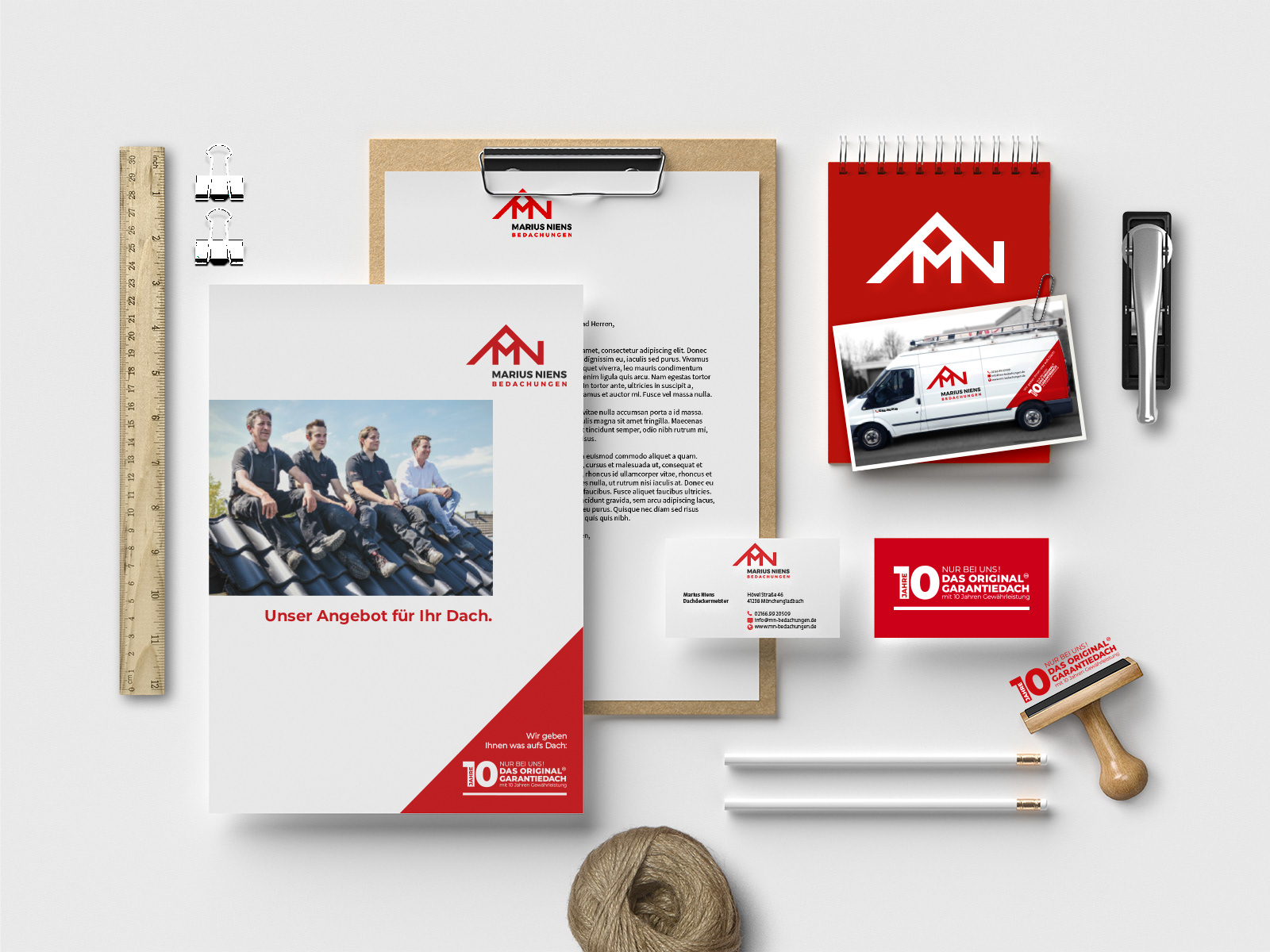 Geschäftsausstattung mit Fahrzeuggestaltung, Flyer und Angebotsmappe für engagierten Dachdecker-Betrieb